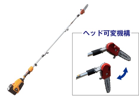 近年、脚立を使った高所作業での転落事故が問題になっていますが、本製品は延長パイプで最長2700mmまで延長できるので、地表から約4~5mの枝打ちも脚立不要で作業ができます。さらにヘッド部が角度可変式なので場所に応じた角度で作業ができます。